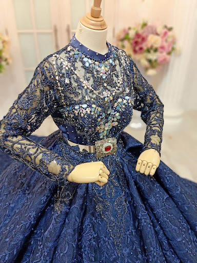 May be an image of indoor. Gaun wedding pengantin elegan tinggi leher afrika muslim renda royal blue. Sdh 2 hari patung tu park kat tgh ruang tamu boleh la buat cuci mata hari2.
